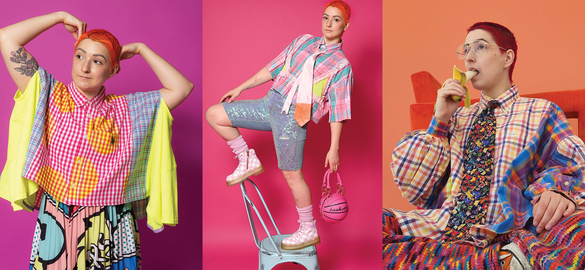 We use preloved materials and small-batch prints to create chaotically colorful pieces meant to help you express your identity to the fullest.